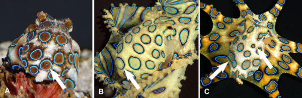 Sparkly iridophores can be temporarily concealed by tweaking a layer of chromatophores above them. However, the blue-ringed octopus lacks the appropriately positioned chromatophores for this (already a sign that it’s a weirdo as far as cephalopods go).