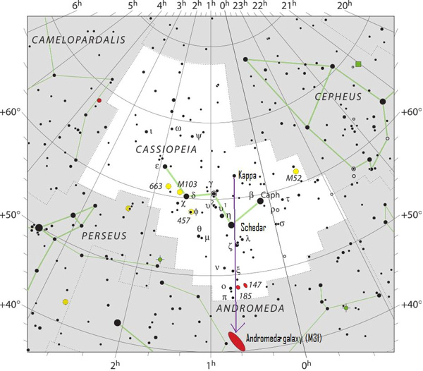 Cassiopeia appears low in the northeast sky at nightfall and early evening, then swings upward as evening deepens into late night. In the wee hours after midnight, Cassiopeia is found high over Polaris, the North Star. Note that one half of the W is more deeply notched than the other half. This deeper V is your “arrow” in the sky, pointing to the Andromeda galaxy.