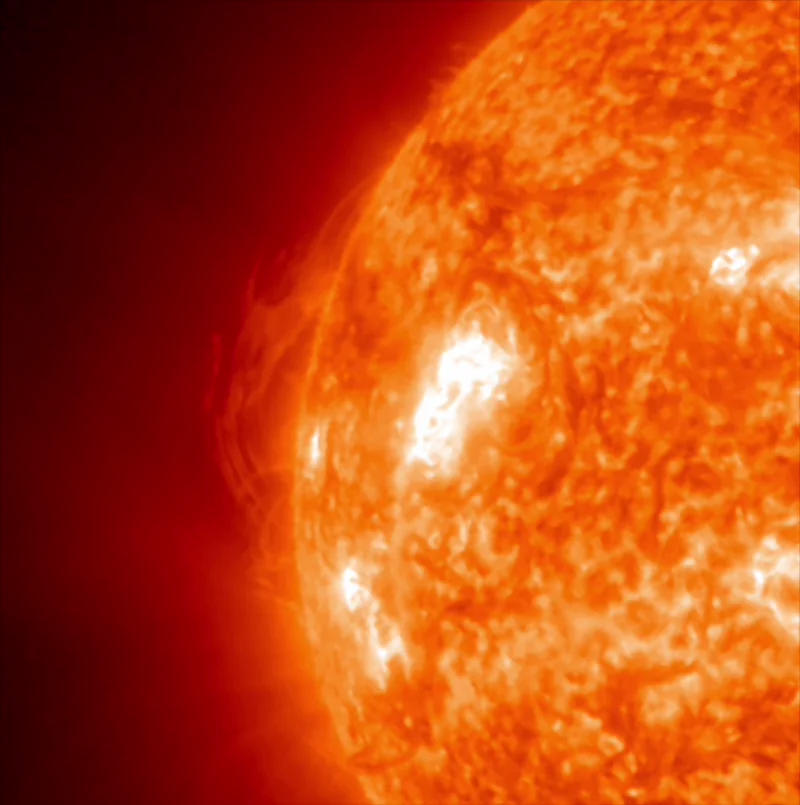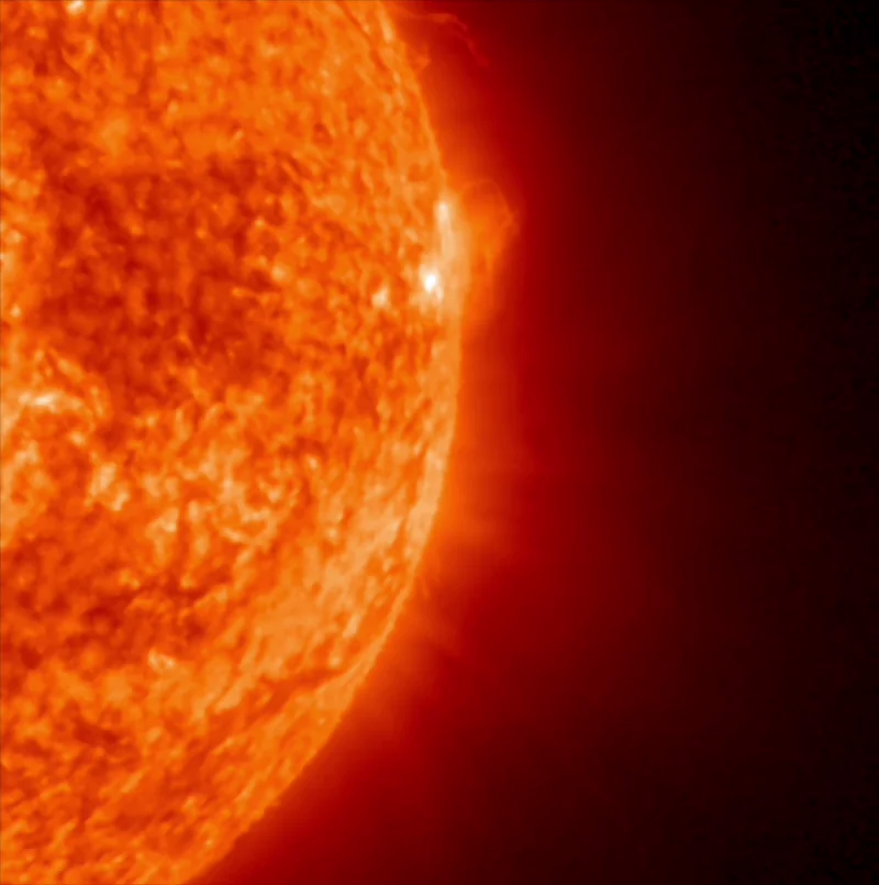 Sun news for December 29-30, 2025. A bright solar prominence rises from an incoming active region on the sun’s southwest limb, seen in GOES-19 SUVI 304 Å. Images via NOAA/GOES.