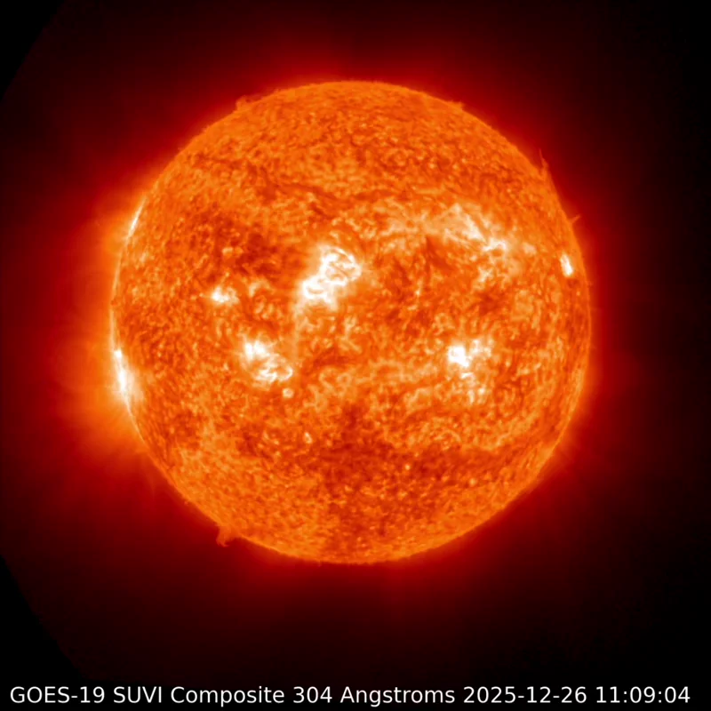 Sun news for December 30-31, 2025. The sun is quiet and calm today with only low-level flaring, as seen in GOES-19 SUVI 304 Å. Forecasters continue to monitor conditions from an M-class flare on December 28 that may make its way to earth today. Images NOAA/GOES.