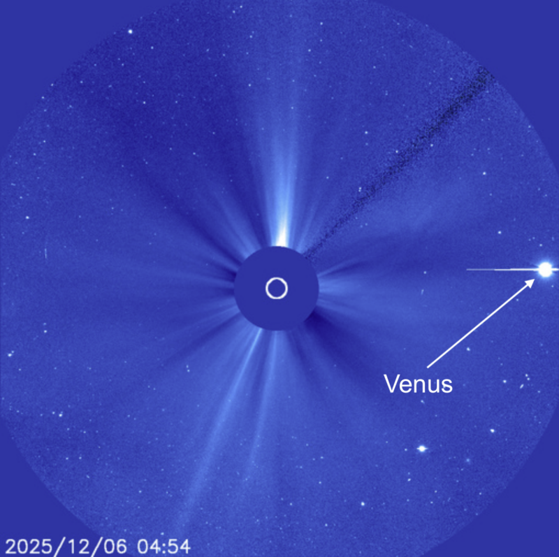 Sun news for December 5-6, 2025. Venus, now visible with its full glory, captured in the SOHO LASCO C2 coronagraph telescope. Images via NASA/SOHO.