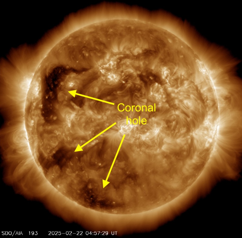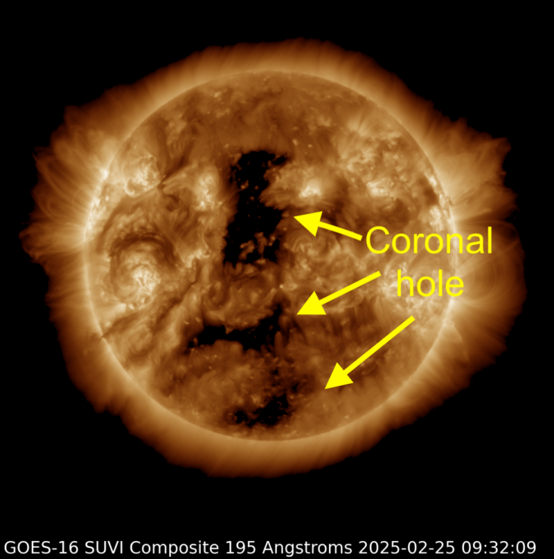 And then there were two! A new, large coronal hole has formed in the sun’s southeast quadrant. And we’ve been observing another one during the past week, which has moved into geoeffective position, that is, a position where it’s capable of affecting Earth. Especially, coronal holes play an important role in space weather, the conditions in near-Earth space (especially electromagnetic radiation and charged particles emitted by the sun) that can affect human technologies. For instance, fast solar wind from coronal holes can provoke disturbances in Earth’s geomagnetic field, sometimes spawning auroral displays. Therefore, when combined with incoming blobs of solar material (CMEs) the results can be dramatic … as with the huge geomagnetic storm back in May 2024 and the one in October 2024.