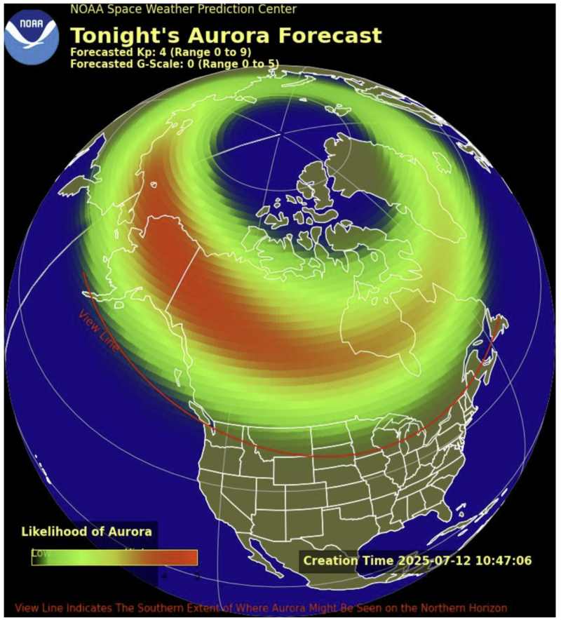 - Geomagnetic activity forecast: Earth’s geomagnetic field might see more G1 (minor) geomagnetic storm levels during the day today. Then it’s expected to reduce to quiet-to-unsettled periods tomorrow (July 14).