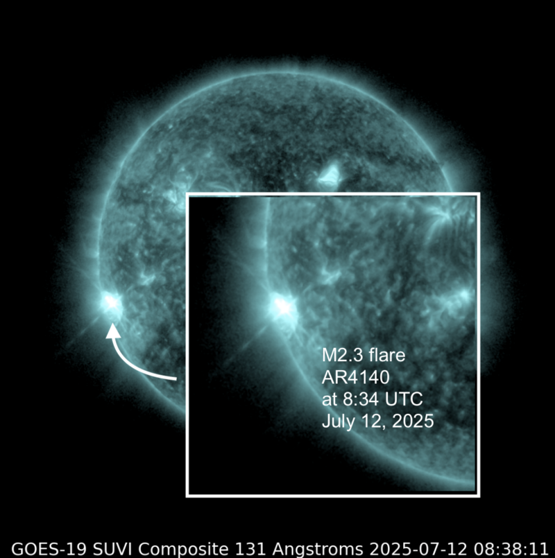 After seeing only faint C flares and B flares for several days, our star surprised us this morning with an M flare! The M2.5 flare was blasted at 4:17 UTC on July 8 by an as-yet-unnumbered sunspot region currently rotating into view over the northeast horizon. Besides the M flare, this newcomer also produced an impressive 12 C flares. Promising! Let’s see what else it’s got in store.