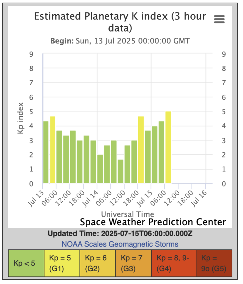 - Earth’s magnetic field has been unsettled to active (Kp = 2 – 5) for the past 24 hours. G1 (minor) geomagnetic storms were observed for two 3-hour periods. The first Kp = 5 level was reached at 20:59 UTC on July 14, and the second is in effect at the time of this writing. These disturbances are the result of fast solar wind from a coronal hole now located in the south solar hemisphere.