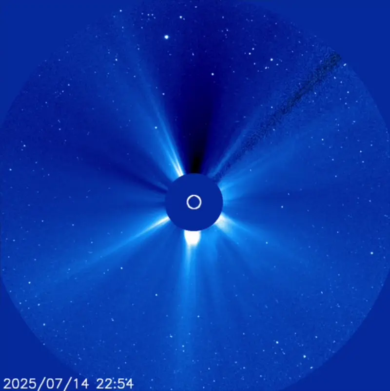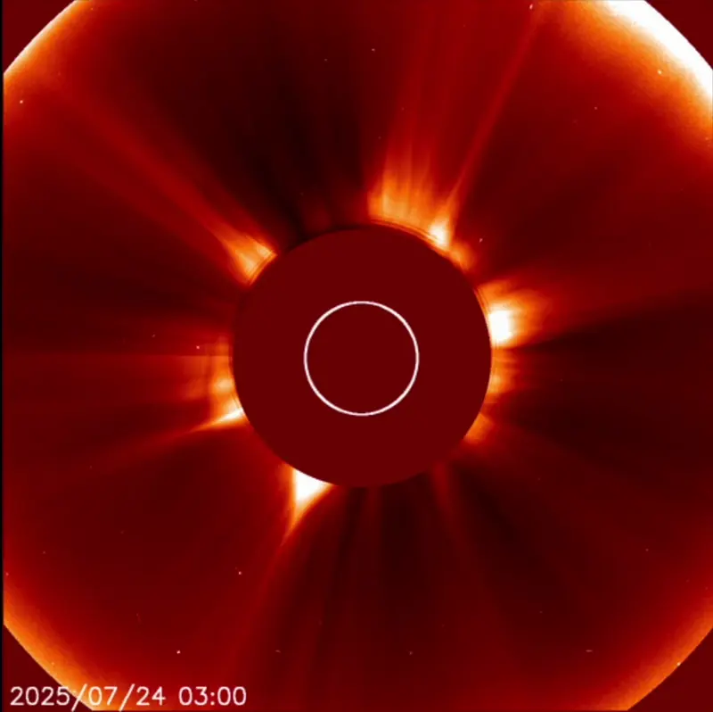 Although sun flaring has been low in recent days, the sun produced a couple of filament eruptions over the past day that hurled solar blobs of plasma and magnetic fields into space. GOES-19/CCOR-1 imager captured the 2nd one, the largest of the two, at around 16:00 UTC on July 24. See the image below. The blast occurred just before new moon – the time each month when the moon passes in front of (or nearly in front of) the sun – from Earth’s point of view. The spacecraft is orbiting Earth, so it gives us robot eyes on this new moon, the first we can recall. GOES-19 captured the moon in fantastic and amazing definition. It’s an amazing new imager!