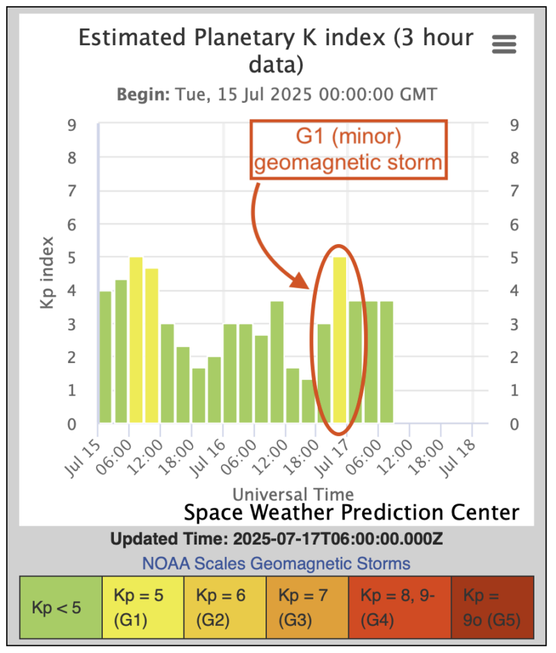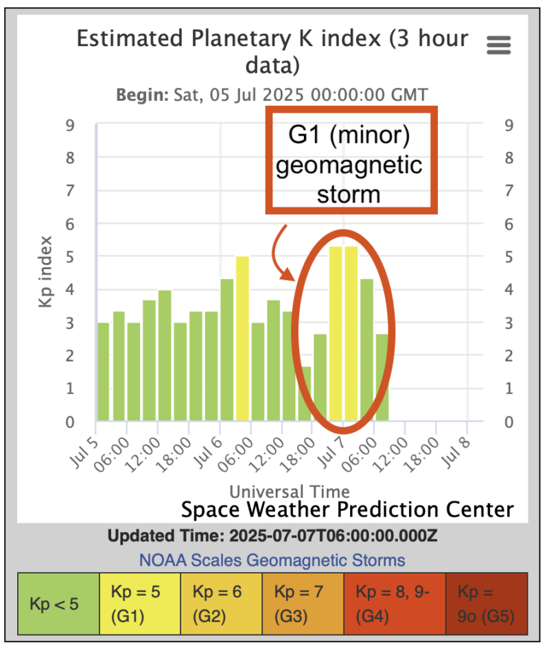 Surprise! We had a G1 (minor) geomagnetic storm last night. It brought conditions for auroral displays at high latitudes. Earth’s geomagnetic field was unsettled to active from late yesterday to early today. Then it suddenly jumped to a Kp = 5 level reaching this level at 5:38 UTC UTC on July 6 and staying there for one 3-hour synoptic period then returning to Kp = 4 and eventually to Kp = 3. These conditions might have been caused by residual effects of a coronal mass ejection (CME) – a chunk of solar materials – passing near Earth and provoking turbulence. Did you see the auroras last night? Share your beautiful photos with us. Submit them here.