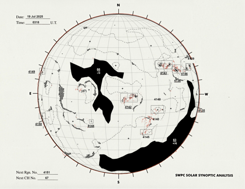 - Geomagnetic activity forecast: Quiet to unsettled conditions are expected for the rest of today as fast solar wind from the southern coronal hole continues to subside. On July 21, conditions are likely to be mostly quiet. A new fast wind stream may arrive around July 22, bringing a chance of active to minor storm intervals.