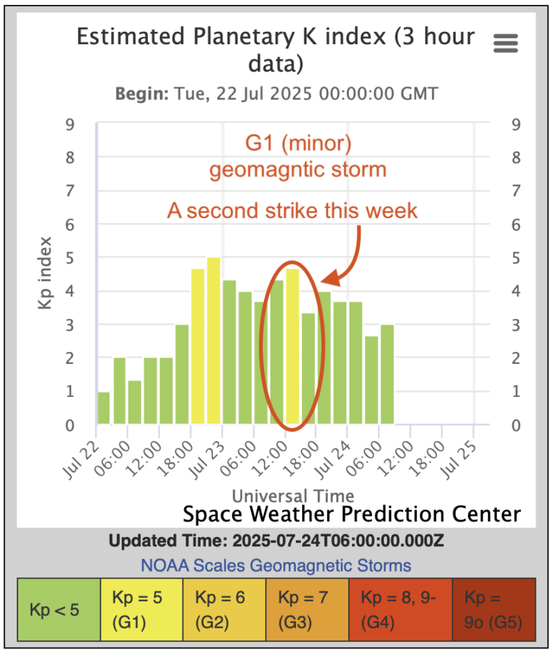 The number of sun flares surged dramatically over the past 24 hours, while the strength of the flares remained low. The sun produced 18 C-class (common) flares, a sharp increase from just four flares the previous day. This uptick suggests increased magnetic instability, even if no M-class (moderate) flares have occurred … yet. At the same time, a high-speed stream (HSS) from a northern coronal hole is forecast to become geoeffective (capable of affecting Earth) late today into July 30. It might get a boost from a smaller coronal hole, now rotating onto the Earth-facing side of the sun.