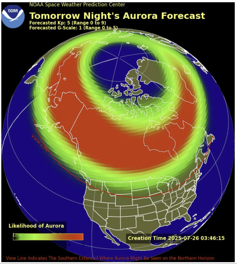 - Blasts from the sun? A narrow coronal mass ejection (CME) associated with a filament eruption on July 25 was observed but is not expected to impact Earth. The anticipated CME from July 23, however, may already be arriving and is the primary driver behind today’s geomagnetic forecast.