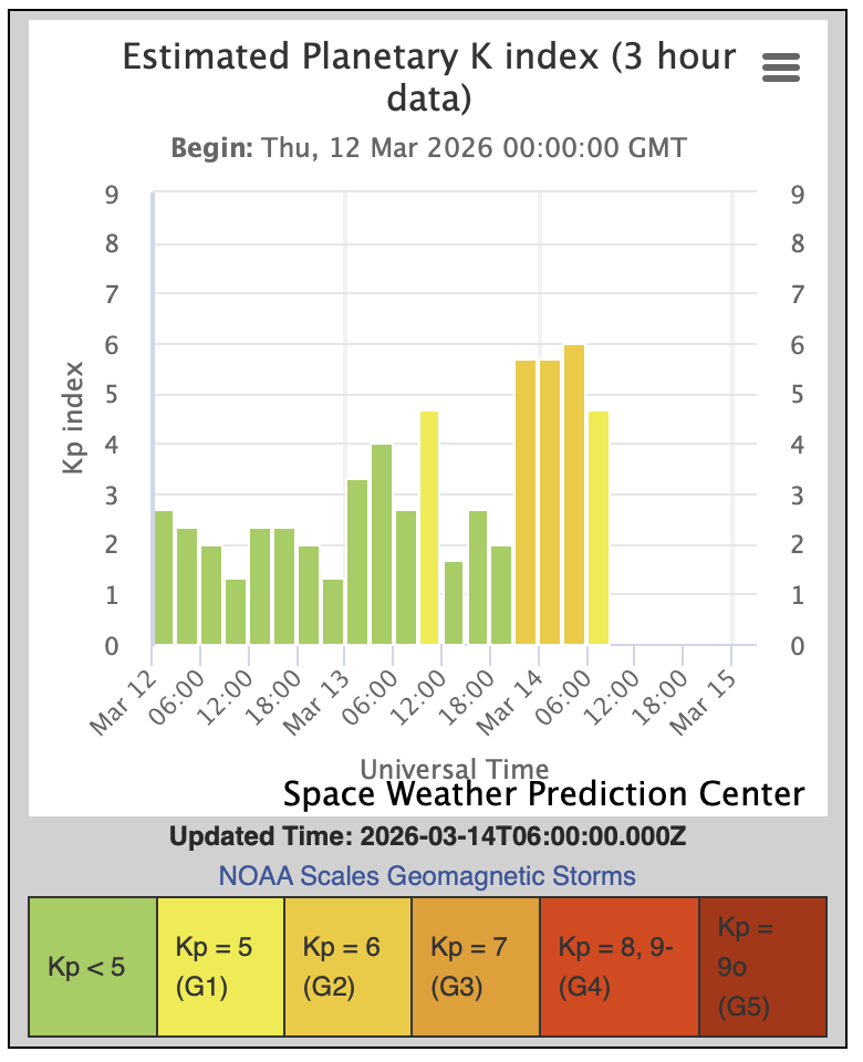 Earth’s magnetic field: The geomagnetic field reached G1 (minor) geomagnetic storm levels during the 6–9 UTC interval on March 25, with Kp reaching 5. This coincided with the initial CME passage and the brief southward Bz excursion. Outside these intervals, conditions ranged from quiet to unsettled (Kp 1–3).