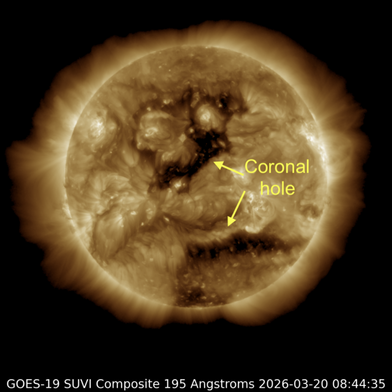 - March 29: Expect quiet-to-unsettled conditions early in the day today. Conditions should transition to more disturbed by late in the day. Enhancements from a recurrent positive-polarity coronal hole high-speed stream (CH HSS) should begin arriving by late March 29. Additionally, two older CMEs have modeled arrival windows today. The March 26 CME shock front should arrive around 9 UTC (Kp 3–5). And the March 25 CME should arrive around 20 UTC (Kp 2–4). Combined with the CH HSS onset, a chance of G1 (minor) storm conditions exists, particularly during the second half of the day. Aurora watchers in Seattle, Edinburgh, southern Scandinavia, and similar geomagnetic latitudes should stay alert for possible displays where skies are clear.