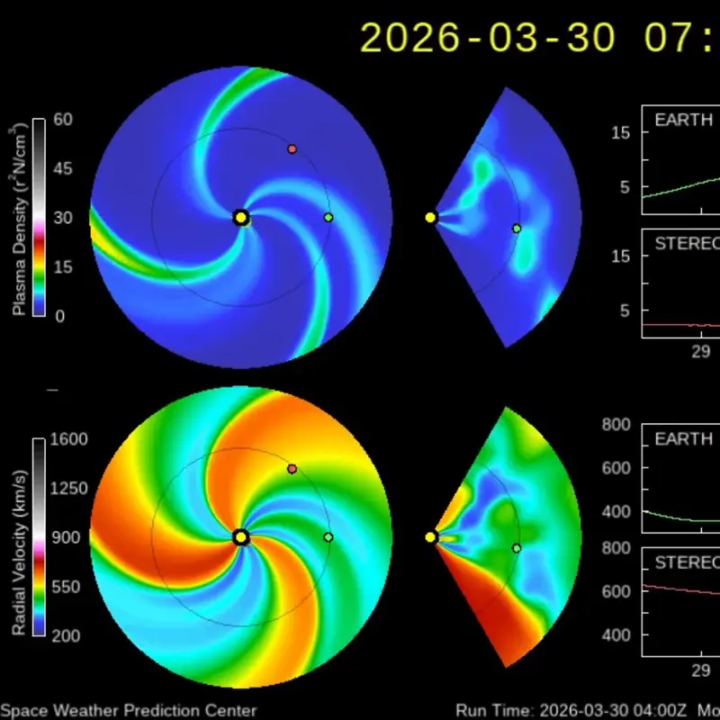 - March 30: Forecasters expect G1 (minor) geomagnetic storming as the coronal hole high-speed stream influence peaks. Solar wind speeds should climb above 500 km/s. Aurora may reach Seattle, Minneapolis, Edinburgh, and the Scottish Highlands where skies are clear. If conditions align favorably with sustained southward Bz, brief G2 (moderate) intervals can’t be ruled out.