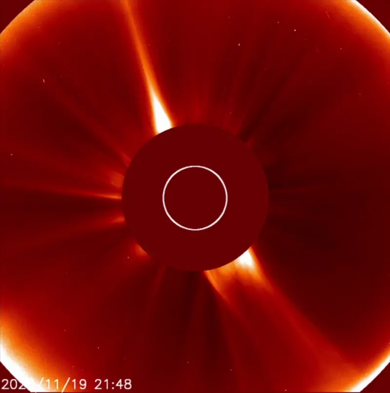 Strong activity on the far side of the sun continues, with huge prominences rising over the northeast solar limb. Around 23:00 UTC on November 26, towering sheets of plasma lifted and swayed above the horizon for nearly two hours, lasting noticeably longer than the prominences seen the previous day. These eruptions came from active regions hidden from Earth’s view, hinting at powerful activity unfolding just beyond the limb and soon to rotate into view.