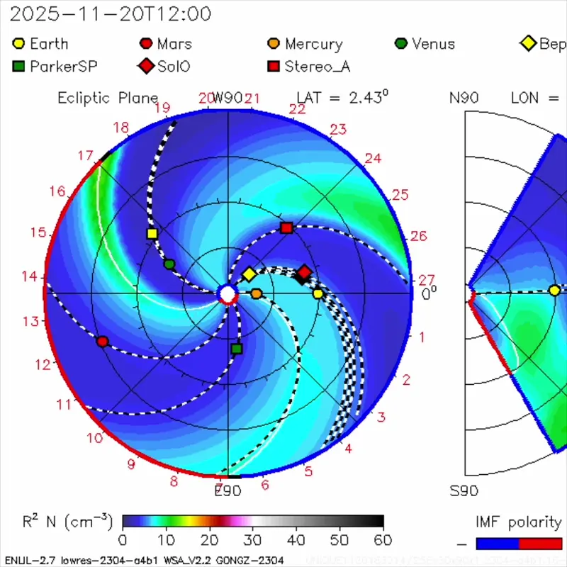 - Solar wind: Solar wind speeds fluctuated dramatically. Winds hovered near 800 km/s for much of November 25, peaking around 820 km/s. By 10 UTC on November 26, speeds measured 755 km/s. The interplanetary magnetic field (IMF) averaged around 6 nT. The Bz component repeatedly switched between northward and southward, with the strongest southward dips reaching -10 nT. At 10 UTC, Bz was northward – a configuration that limits auroral activity.
