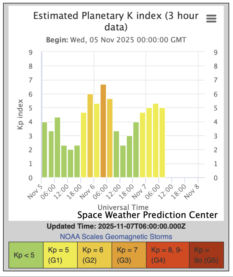 - Earth’s magnetic field: Earth’s magnetic field remained disturbed, ranging from unsettled to active levels. No G1 (minor) geomagnetic storm occurred, but the Kp index stayed near 4 for much of the period — just one step below storm level (Kp 5). At the time of writing, Kp remains at 4.