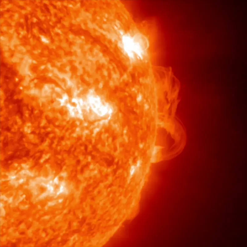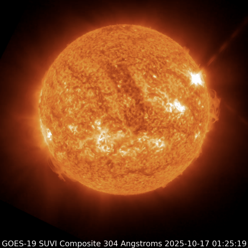 The far side of our star continues as the focus of flare and eruption activity. Signs of this activity show around the whole horizon of the Earth-facing sun now. A huge prominence on the sun’s southeast limb or edge attracted our attention. This filament eruption occurred at around 18:20 UTC on October 24. No flare activity was associated with this event, since it was a blast from the far side. As usual with eruptions on the far side, ejecta hurled into space is not headed our way at Earth. But here’s something interesting. A long-lasting fiery prominence on the northeast horizon might be coming our way, to the side of our sun we see from Earth, carried by the sun’s rotation. The Earth-facing sun appears to have been taking a break! Will this northeastern action end it? We’ll know for sure in the coming days.