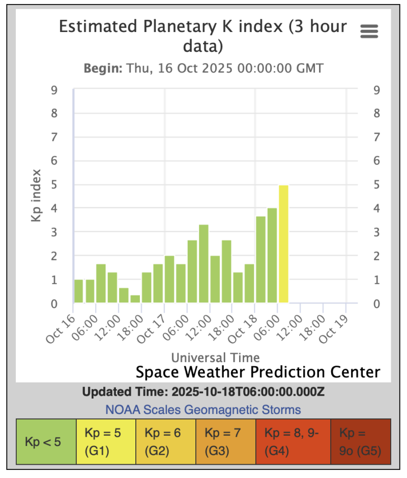 - Oct 5: Mostly quiet to unsettled conditions, with a slight chance for isolated G1 (Minor) storming while the high-speed stream continues to weaken.