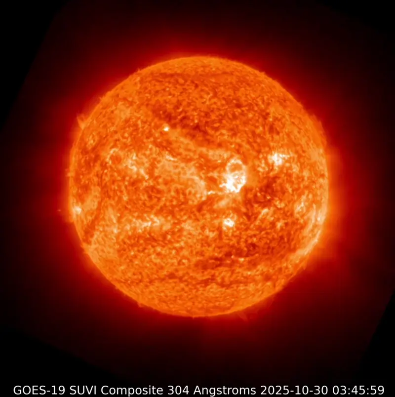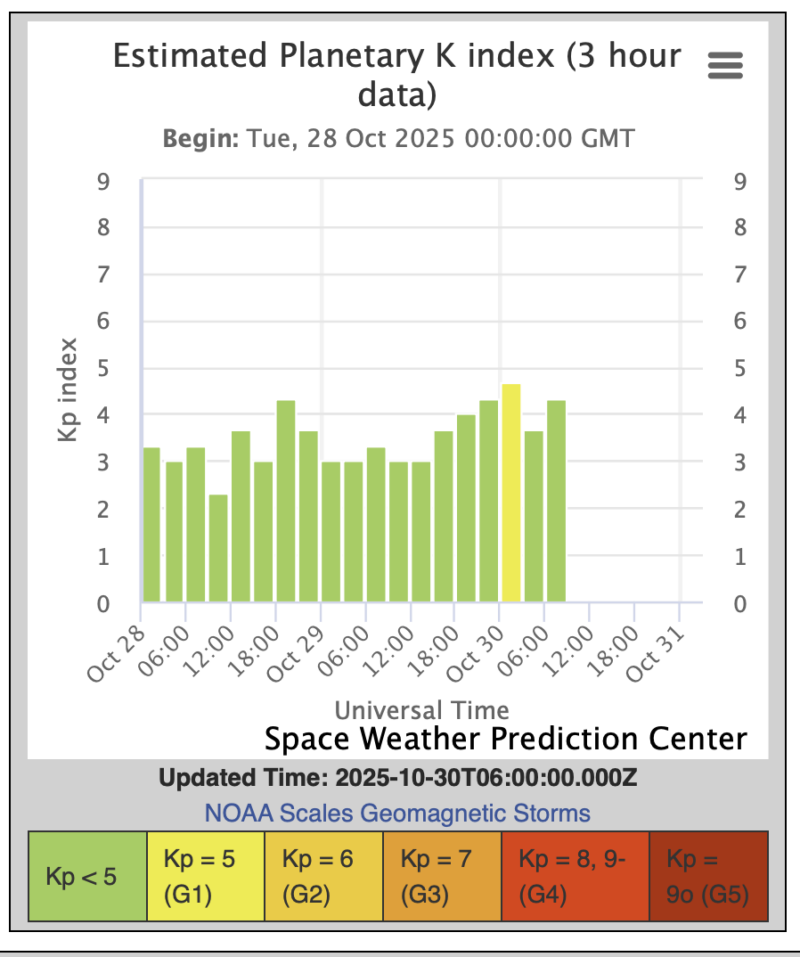 - Earth’s magnetic field: Geomagnetic conditions ranged from unsettled to active (Kp 3–5). A G1 (minor) geomagnetic storm occurred, with Kp reaching 5 at 00:00 UTC on October 30; Kp was a little above 4 at 11:00 UTC.