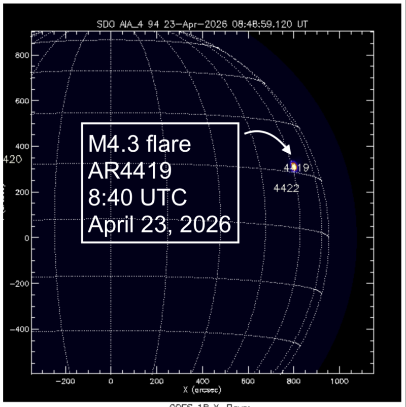 - Strongest flare: B4.4 from AR4416 (N20W87) at 23:13 UTC on April 18. This was a minor event, well below the threshold for any radio blackout. Notably, the period’s largest event in the broader NOAA summary was a C1.6 flare from AR4416 peaking at 7:04 UTC on April 18, just before our EarthSky reporting window opened.