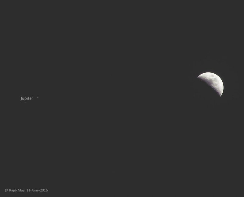 If you had looked with your eye, you would have seen Jupiter near the moon on the night of June 11, 2016. Photo by Rima Biswas.Telescopes and telephotos lens show more detail. This photo of the moon and Jupiter is from EarthSky Facebook friend Nikolaos Pantazis in Athens, Greece on June 11, 2016.Our friend Patrick Casaert at La Lune The Moon in Meaux, France, caught this shot of the moon and Jupiter on June 11.The moon was nearly a first quarter moon on the evening of June 11. Here’s Jupiter with 4 Jovian satellites via our friend Lunar 101 – MoonBook in Toronto.Dennis Anatassiou wrote: “Moon with Jupiter in the upper right with its own moons … plus a ghost image of the moon (lens reflection).” Sometimes lens flares like this one make really nice photos!Rajib Maji in India caught this photo of the moon and Jupiter on June 11.Another photo showing what the eye would have seen on the night of June 11, from Suzanne Murphy Photography in Wisconsin.Robert Kelly caught the moon and Jupiter on June 11 over Las Vegas, Nevada. He caught one of Jupiter’s moons, too!Helio C. Vital in Rio de Janeiro, Brazil, caught the moon and Jupiter in daylight on June 11. He wrote: “I used my Sony Cyber-Shot HX300 on a tripod to take the photos. It can give nice photos even at zooms higher than 100x.”Karthik Easvur in Pondicherry, India caught the moon and Jupiter on June 11.Here are the moon and Jupiter on the night of June 10 … plus a moondog, 22-degree halo and an upper tangent arc. From our friend Dee Hartin Photography in Australia.Even on the night of June 9, 2016, Jupiter was the brightest object near the moon. Photo by Patricia Evans in Seabrook, New Hampshire.