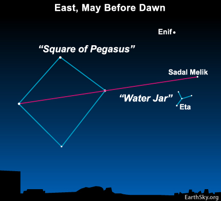Still, if you think you’ll enjoy identifying the radiant for the Eta Aquarids, check out the chart below. It shows the sky scene from mid-northern latitudes just before the onset of morning twilight. The Y-shaped “Water Jar” is the most prominent feature in the otherwise inconspicuous constellation Aquarius. This distinctive Y-shaped pattern of stars closely aligns with the radiant point of the Eta Aquariid shower.