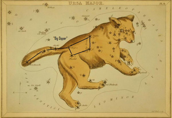 But Merak, Mizar, Alioth, Megrez and Phecda are part of a single star grouping. They probably were born together from a single cloud of gas and dust, and they’re still moving together as a family.
